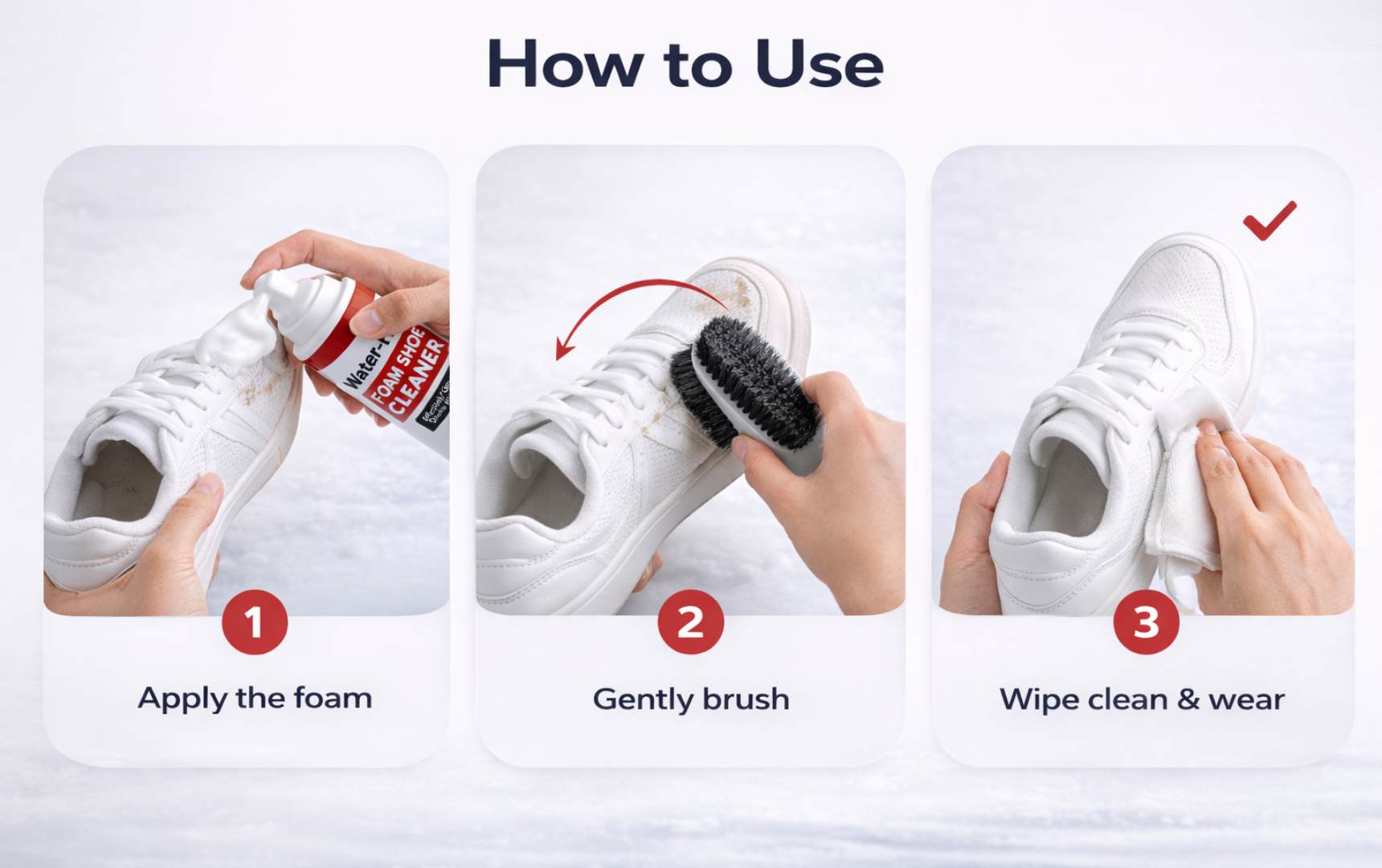 Just apply, gently brush, and wipe — your sneakers look fresh and ready to wear within seconds.