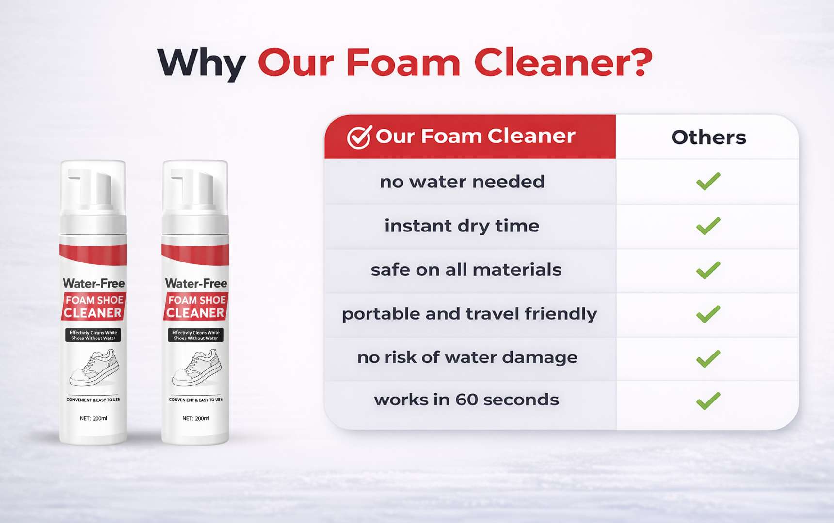 Our advanced water-free foam lifts dirt, stains, and grime instantly without soaking your shoes.